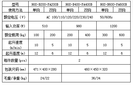 PA600B微型電動(dòng)葫蘆技術(shù)參數(shù)表: